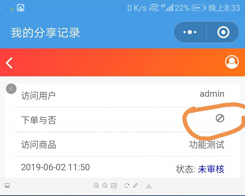 3、客户下单后,拼团分销者分享记录里是否下单显示为“否”;