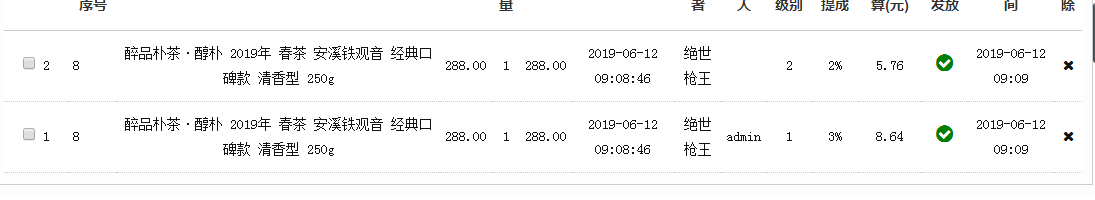 id是2的那个购买的产品,admin是一级推荐人,id是2的那个是被推荐人,被推荐人购买商品推荐人获得佣金没问题,但是那个被推荐人为什么自动成为二级分销并且在未推荐其他人的情况下直接拿了二级的佣金?