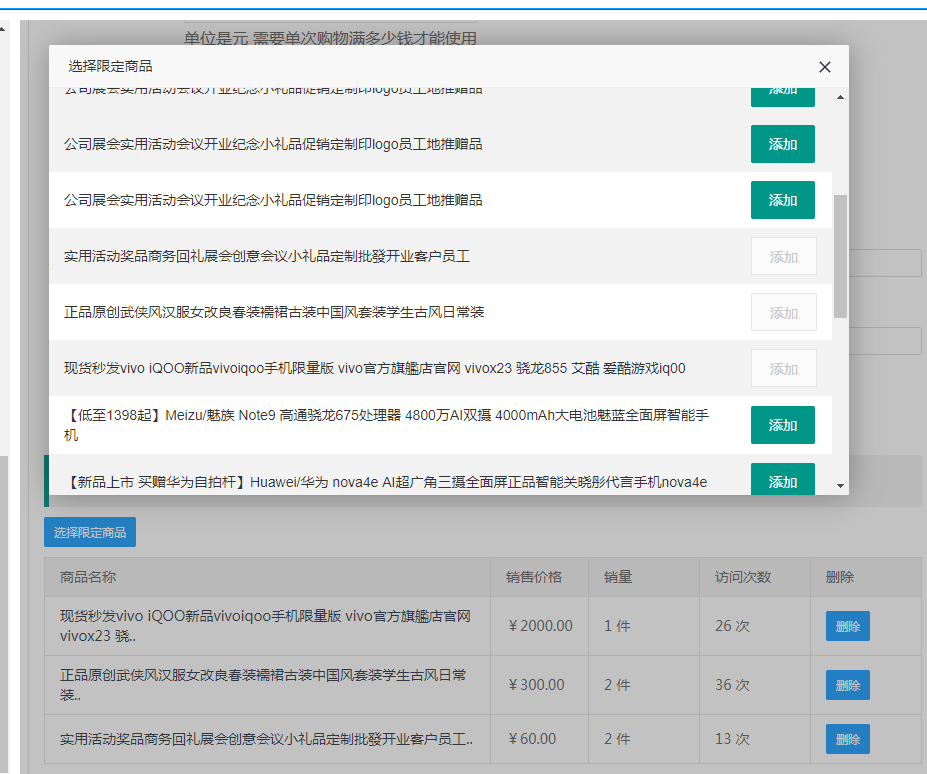 如图所示 新增的时候 我们可以进行商品的选择 不选择就是全店通用券 选择了就是限制了只能在这几个商品使用。