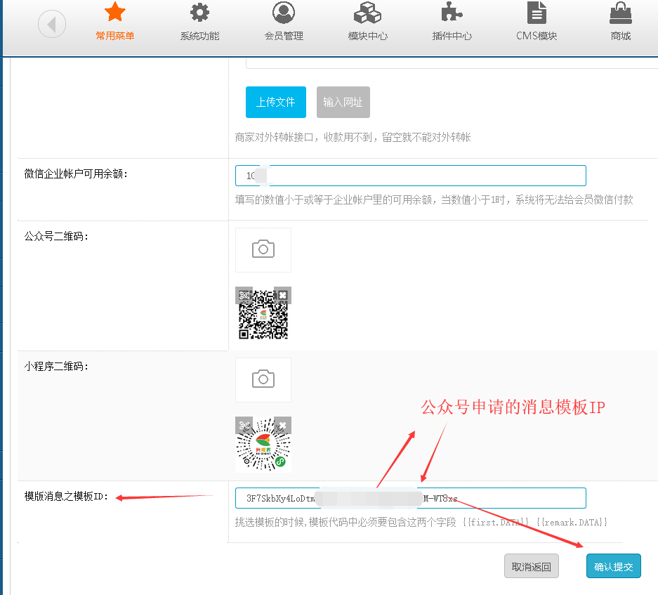 微信消息模版 先到公众号申请开通,审批下来,到相关栏目,找到几个通信模板,选择后提交,然后把相关微信消息模版IP 复制下来,找到网站后台系统管理最下面,添加微信消息模版