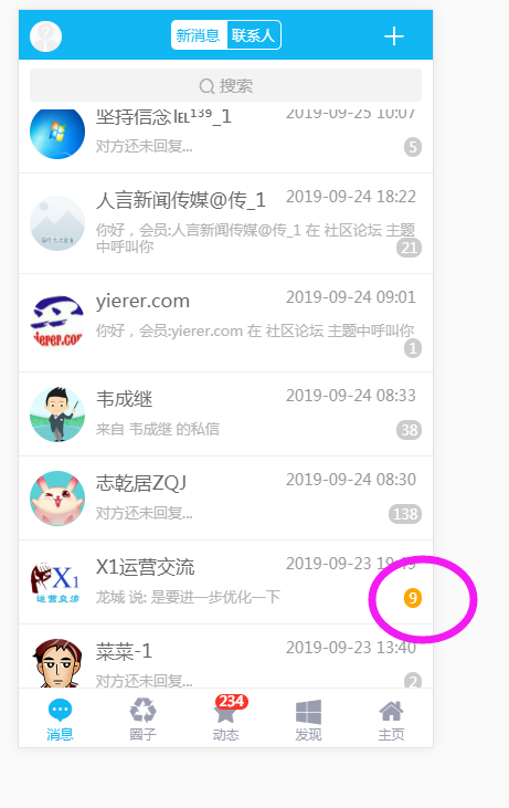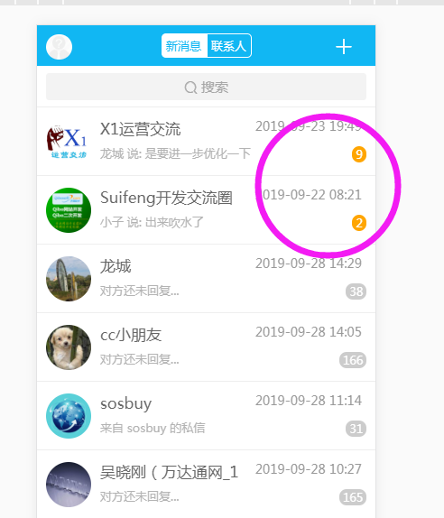 如下图所示,之前存在的问题,就是新消息会把群消息压下去。只有在群里发过信息才会排在前面,如果一直不在群里发消息那个群的会话框就会被压在底下了,即使群里有新消息也看不到提醒。