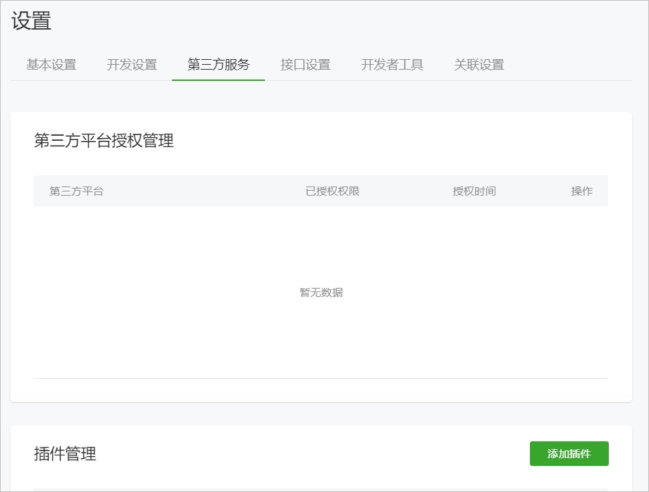在使用视频插件之前,我们先来介绍如何获得这个插件,小程序插件需要开发者同意才能获得使用权,我们可以在小程序的【设置 -> 第三方服务】里面看到对应的入口。