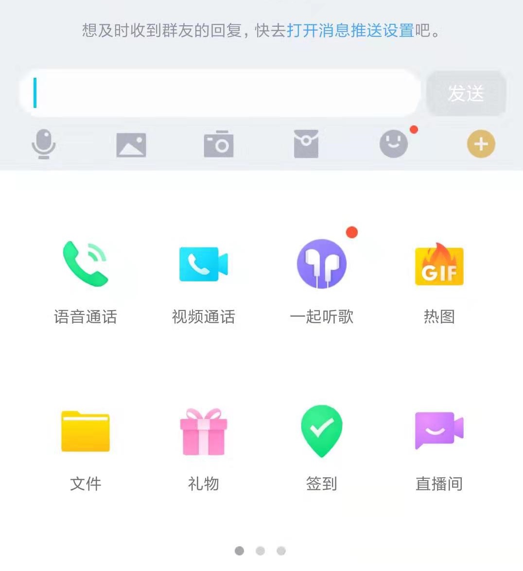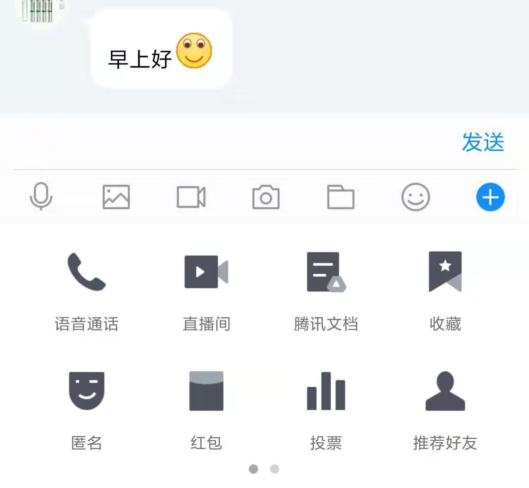 其输入框下面一组常用图标,简洁易懂。+下面更多功能。如下图: