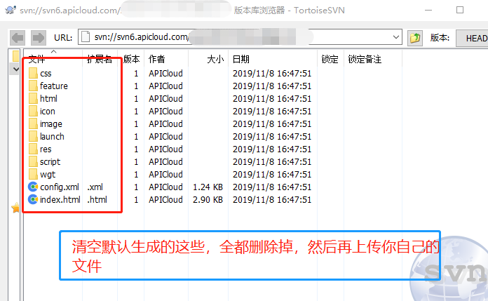 上传之前先把默认文件清空,然后力SVN客户端上传就可以了