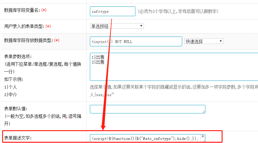 代码如下:<script>$(function(){$("#form_group_infotype").hide();});</script> 填进描述里就不显示了,非常感谢。