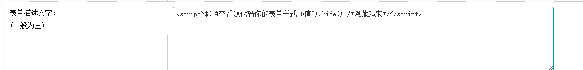 <script>$("#查看源代码你的表单样式ID值").hide();/*隐藏起来*/</script>