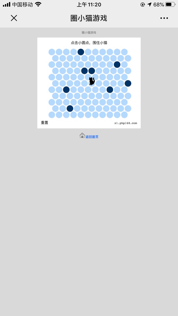 很经典很好玩的小游戏,用鼠标控制,点格空处下棋子,把猫圈住,直到它无处可逃算你赢!