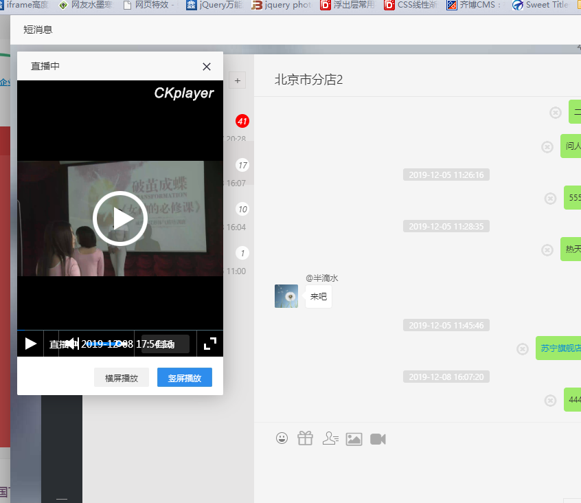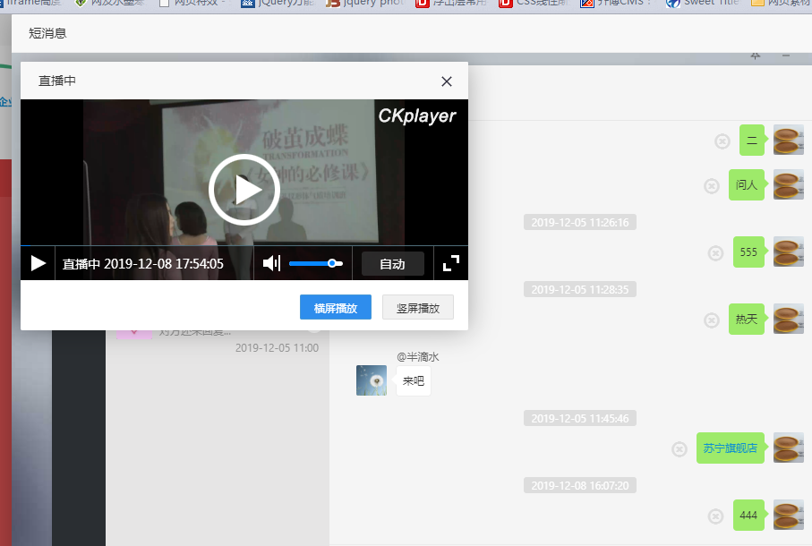 function ck_play(url){ layer.open({ type: 1, offset: ['10px', '10px'], anim: 5, fixed: false, shade: 0, title: '直播中', area: ['500px', '300px'], content: "<div id=\"video\" style=\"width:100%;height:100%;\"></div><script type=\"text/javascript\">var videoObject = {container: '#video',variable: 'player',flashplayer:false,live:true,video:'" + url + "'};var player=new ckplayer(videoObject);</script>", btn: ['横屏播放', '竖屏播放'], yes: function(index, layero) { $(".layui-layer-btn0").css({"border-color": "#4898d5","background-color": "#2e8ded","color": "#fff"}); $(".layui-layer-btn1").css({"border-color": "#f1f1f1","background-color": "#f1f1f1","color": "#333"}); layer.style(index, {width: '500px',height: '300px'}); return false }, btn2: function(index) { $(".layui-layer-btn1").css({"border-color": "#4898d5","background-color": "#2e8ded","color": "#fff"}); $(".layui-layer-btn0").css({"border-color": "#f1f1f1","background-color": "#f1f1f1","color": "#333"}); layer.style(index, {width: '300px',height: '500px'}); return false } }); }