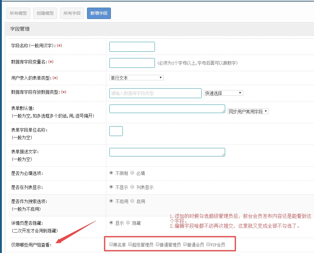 1. 只有字段添加时可以勾选哪些用户组查看。比如勾选超级管理员提交后。但是前台普通会员发布内容还是可以看到这个字段。