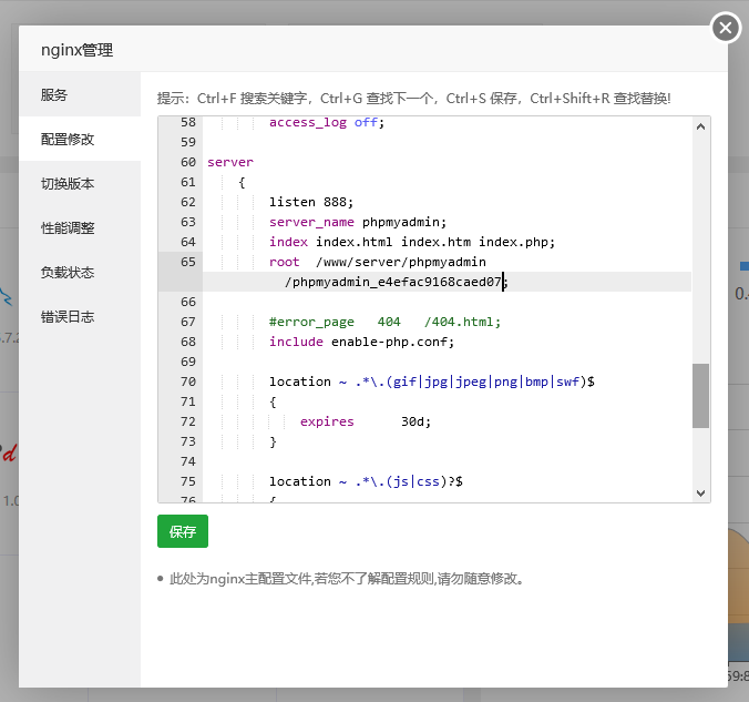 打开nginx配置页面,在配置修改里可以看到这样一行,