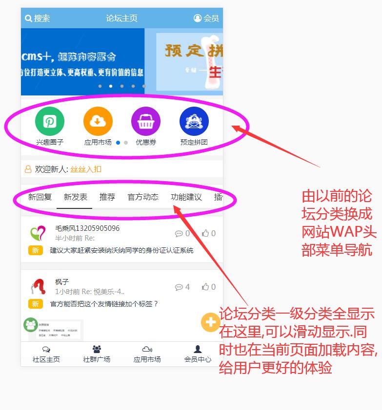 然后把论坛的分类放在了新回复,新发表那里,仿今日头条的滚动显示(毕竟用户习惯了今日头条那种看信息的方式)。 同时分类也在当前页面加载显示,这样可以给到用户更好的体验。因为类似内容却要新开页面的话,给用户体验感比较差。