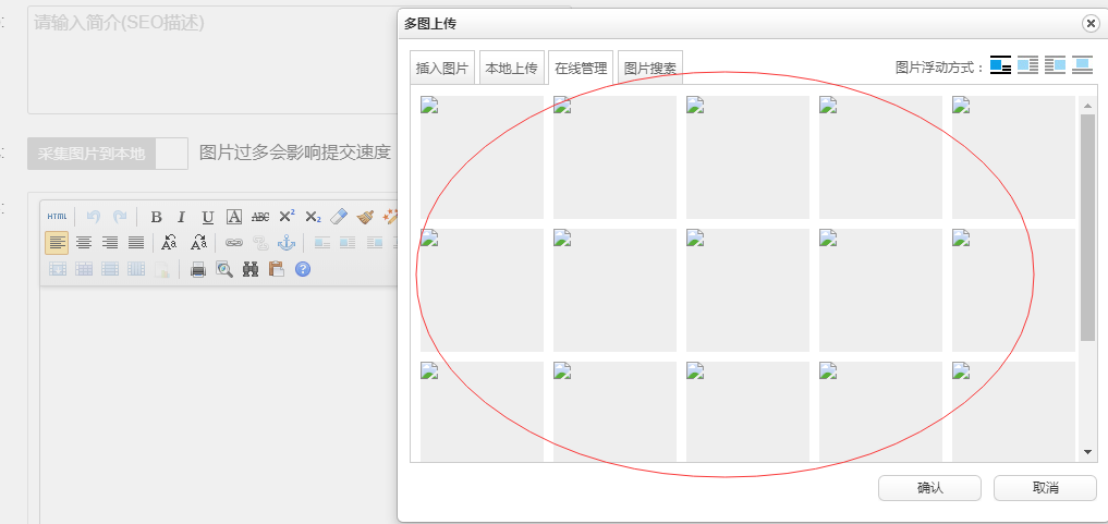 缩略图可以用这个站内选择也行,编辑器批量上传图片的在线管理我这边全是"XXXX"这个应该是站内图片选择的吗?
