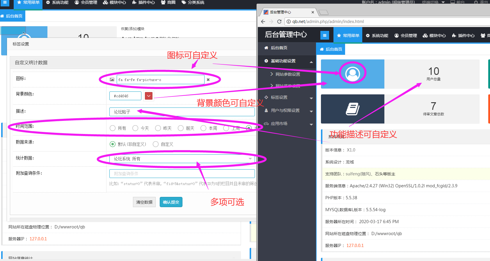 考虑至此,我们提供一个万能的数据统计碎片标签,大家可以随意调全站的任何多个数据表进行统计。并且还可以按不同的条件进行统计。