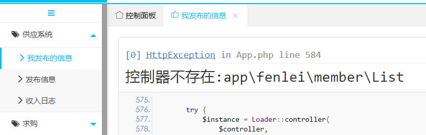 在调试的时候,用普通会员的身份登陆会员中心,随手点了下,“我发布的信息”,结果就报出了控制器不存的错误,截图如下。