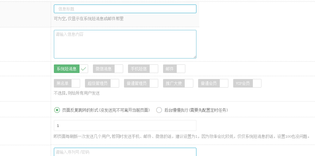 还有手机短信,如果没有绑定的话群发默认好像对已选择的用户组群发,