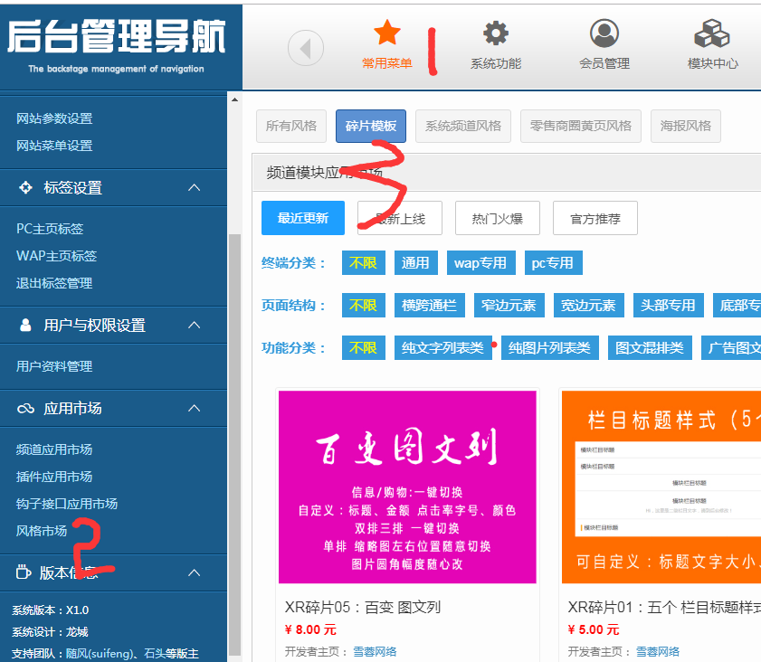 后台-常用菜单-应用市场-风格市场-碎片模板。