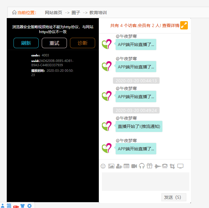 而且使用腾讯云直播时,播流地址是正常的,但是在论坛里无法显示直播提醒,进群聊里,也看不到直播画面,就象完全失联了一样。