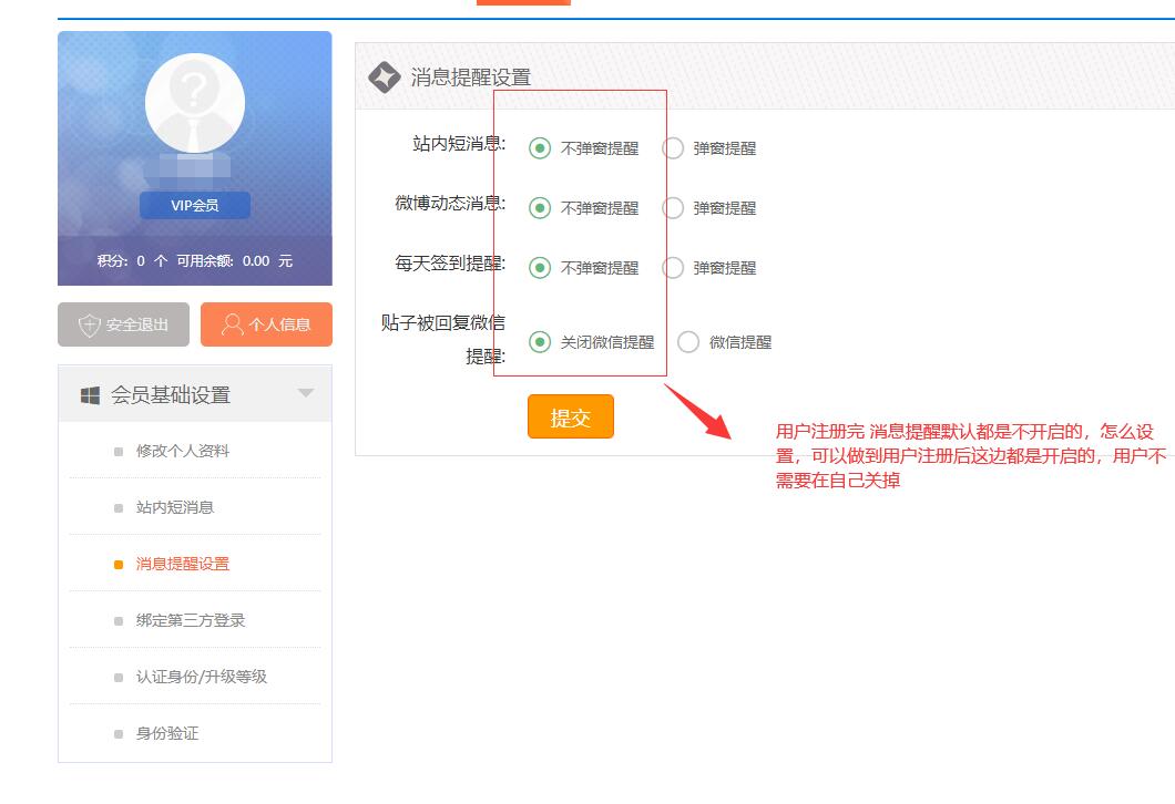 会员注册后,站内消息提醒设置怎么设置为默认开启,