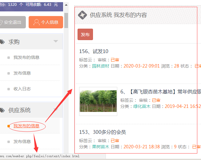 4、 在检查过程中发现,超管身份系统生成的链接与普通会员生成的这个链接是不同的,所以才出现了超管是可以正常查看已发布的分类信息,普通会员点击查看已发布信息报控制器不存在的错误