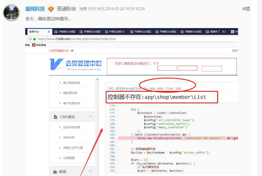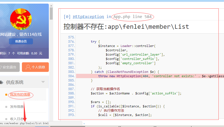其他朋友报错的截图,一样的控制器错误类型,错误代码行都是 app.php line 584,咋这么巧啊
