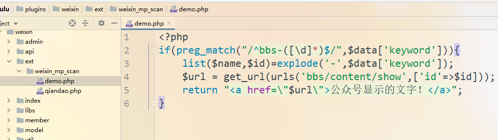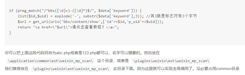 文档中有详细的说明,那我们就可以在 \plugins\weixin\ext\weixin_mp_scan\ 目录下面建立一个任意的php文件。没有这个目录的手工创建就可以。