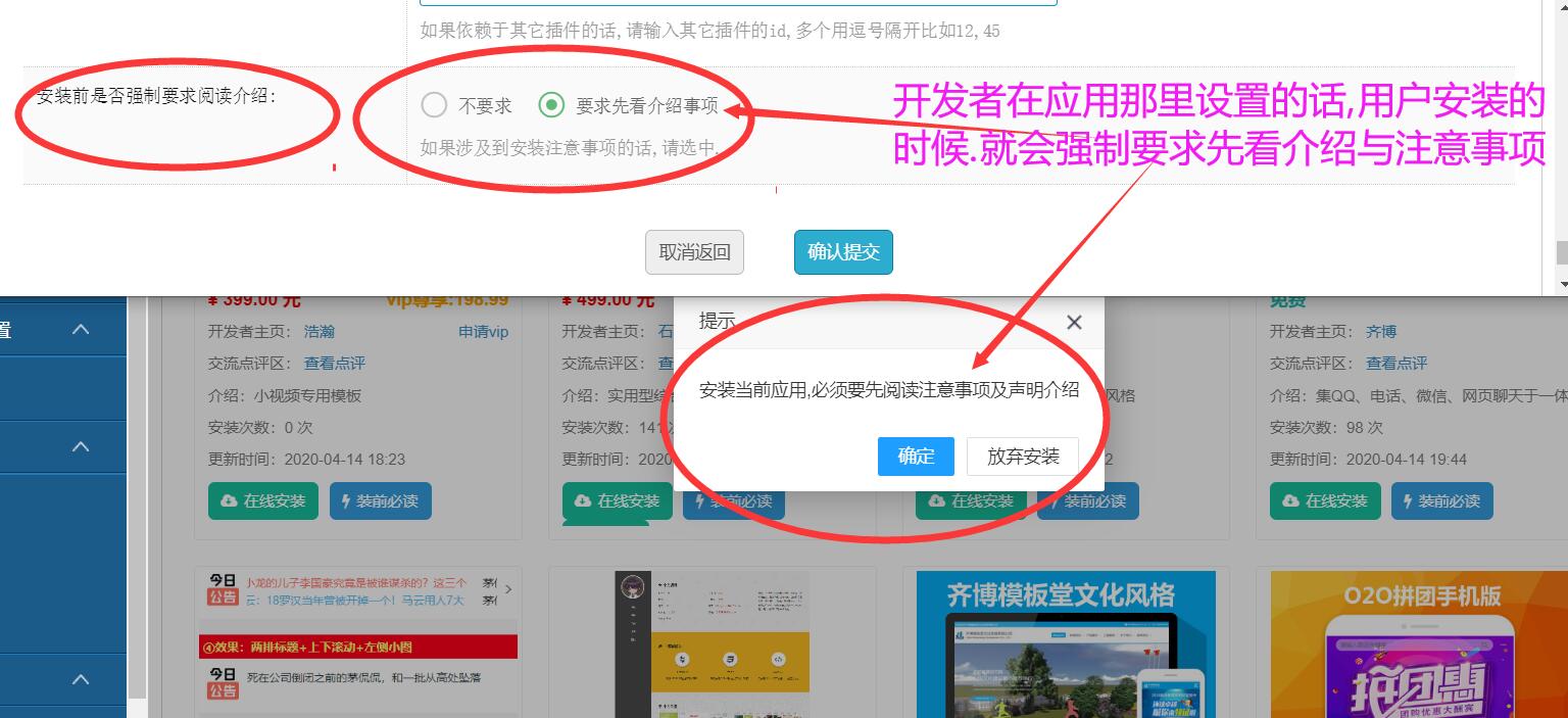 为解决这个问题,现在应用市场进一步优化升级。开发者在发布应用的时候,可以设置要求用户强制看安装说明介绍。那么用户安装的时候,就必须要看安装说明介绍才能进行安装。