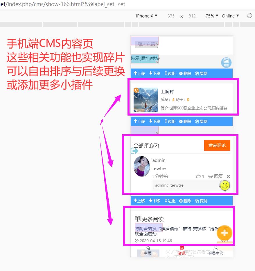 如下图所示,CMS的移动端内容页也增加了碎片功能,不仅可以自由排序,删除,后续也可以更换更漂亮更精致的碎片小插件。以满足更多个性需求。