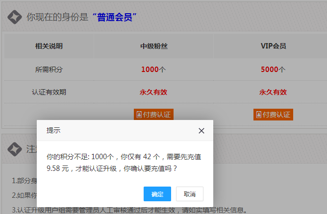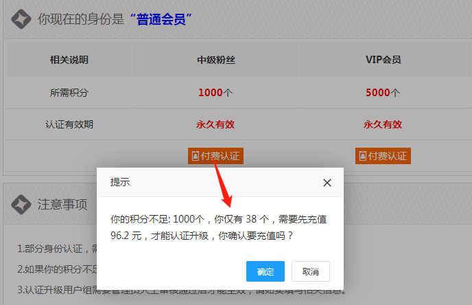由普通会员升级到中级粉丝,需要1000积分,现有积分为38个,那应该还需要1000-38=962个,因为管理后台设置的是1=1000积分,那应该需要充值为0.962元才对。但实际需要充值96.2元?