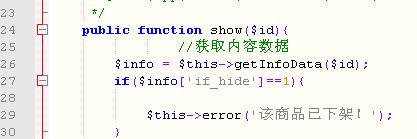 $info = $this->getInfoData($id); if($info['if_hide']==1){ $this->error('该商品已下架!'); }