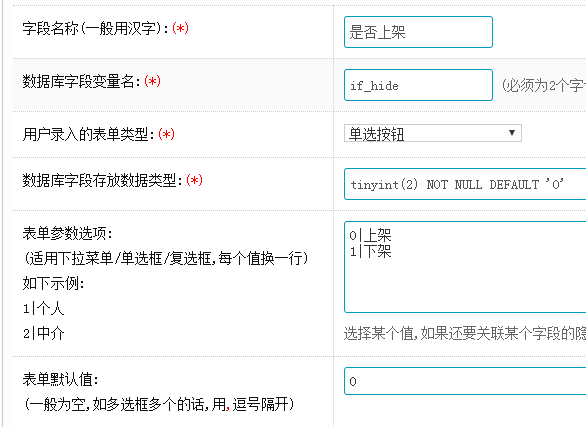 1,在商品模型中添架字段:if_hide , 0|上架 1|下架。