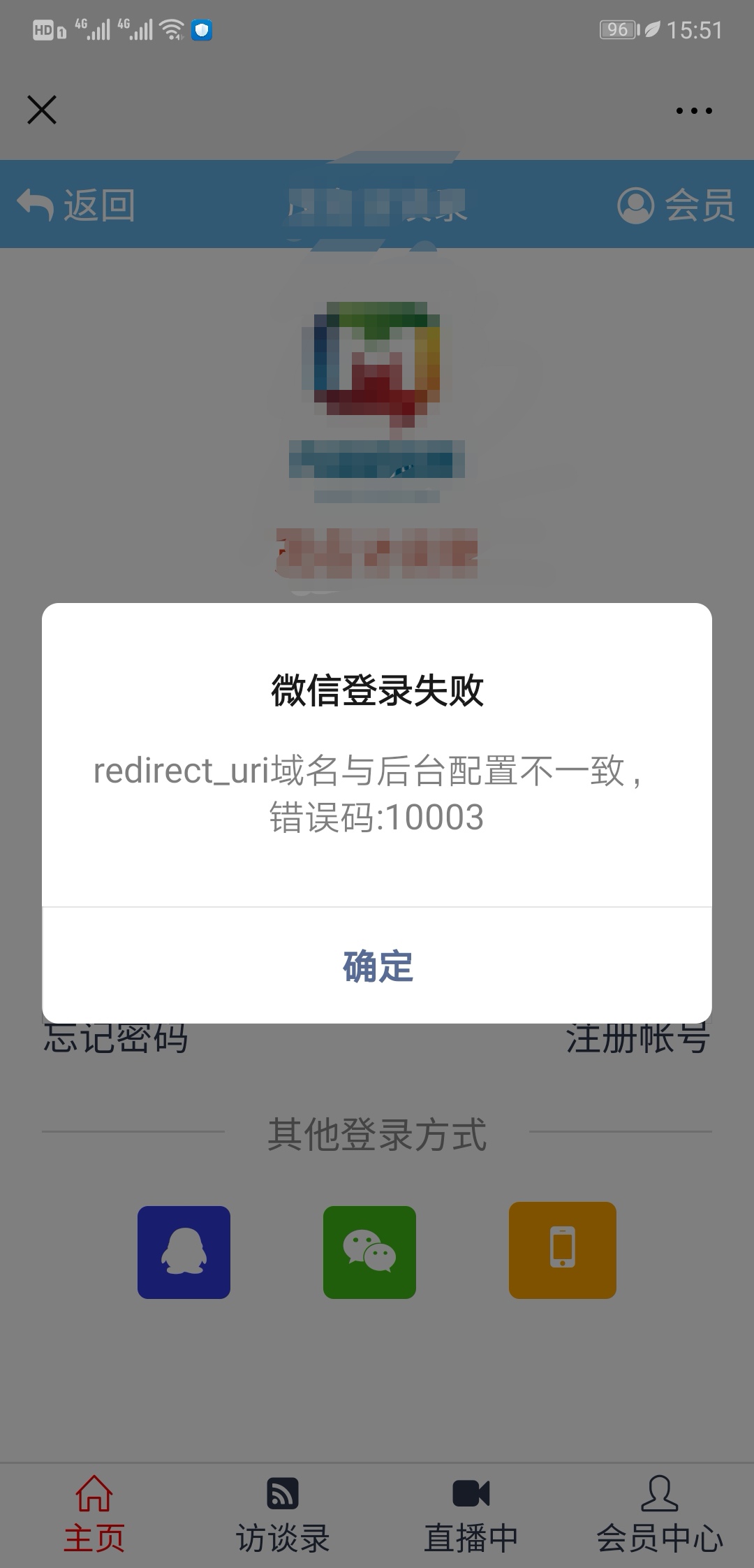 求助:手机访问X1,通过微信登录,显示 微信登录redirect_uri域名与后台配置不一致 错误码:10003 如下图: