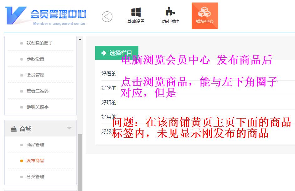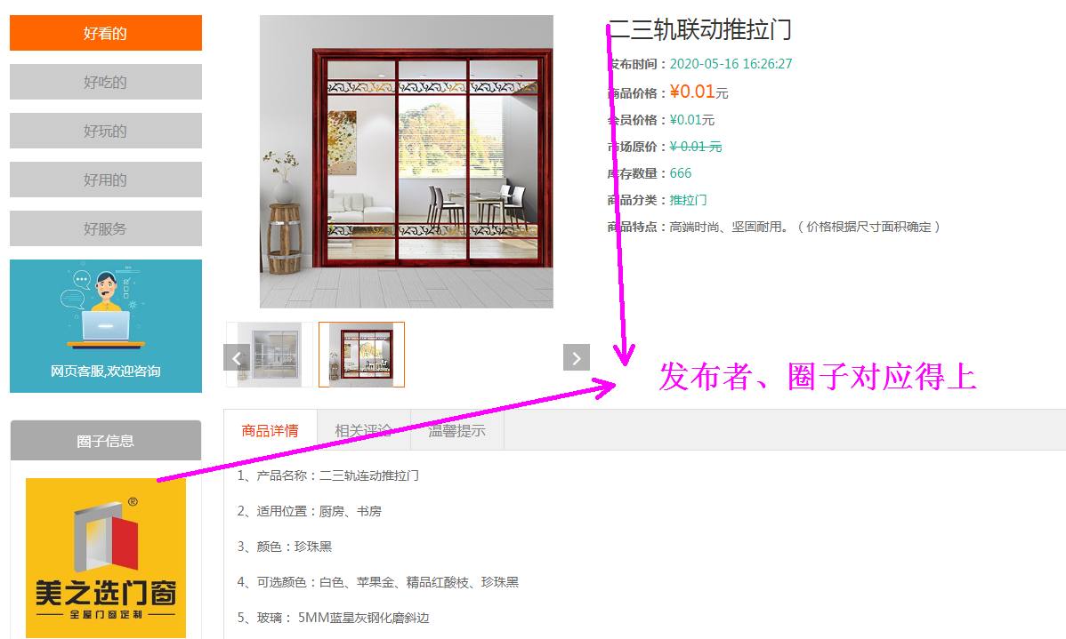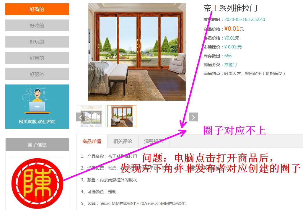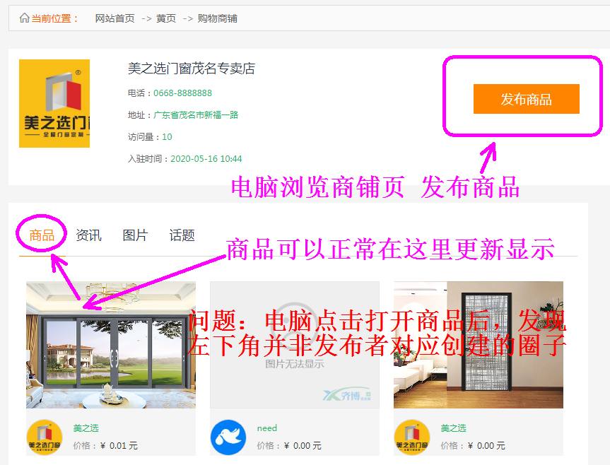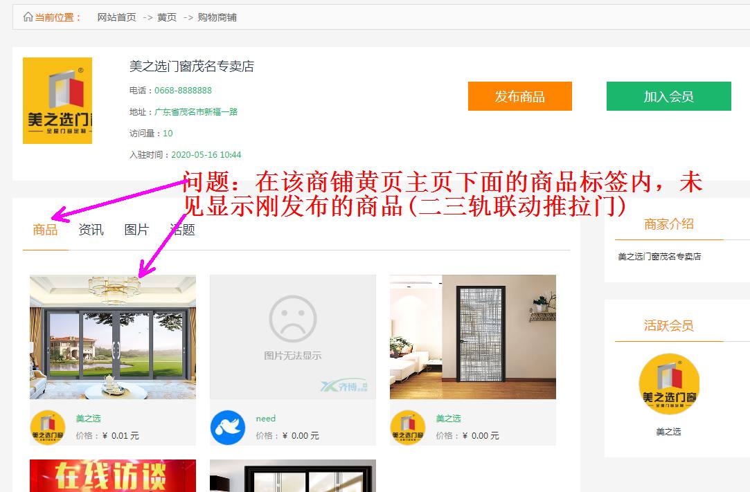 问题:在该商铺黄页主页下面的商品标签内,未见显示刚发布的商品(二三轨联动推拉门)