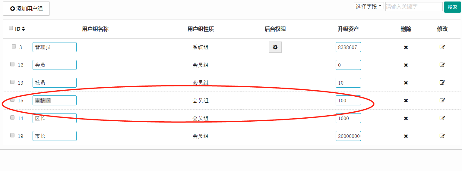 我设了三个会员级别,一是0资产的,会员游客,二是10个资产(积分)社区社员,三是审核 员,达到100资产(积分)