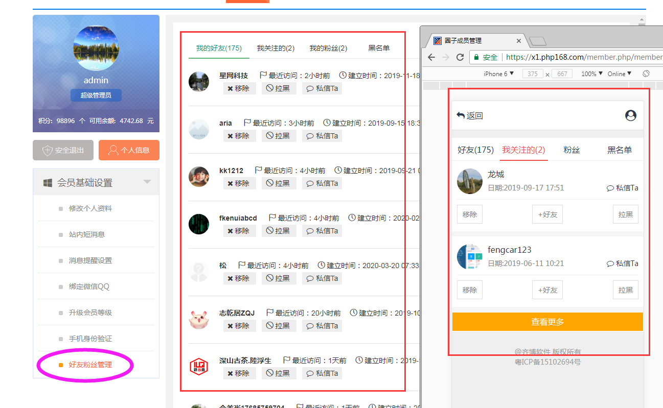 当然对于粉丝好友的功能,这只是冰山一角,牛刀小试. 后续可以通过插件扩展, 实现接收好友的动态. 类似之前发布过的微博. 但又不想做成跟微博那样.什么乱七八糟的动态都一起接收. 而是取其精华去其糟粕. 当然插件扩展尽量设置开关,让用户自己选择,以满足个性化的需求。