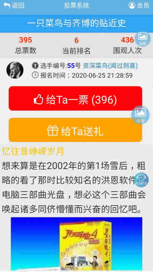 以后征文投票实际应用中, 也许会有更长的文章好几千字乃至上万。这样支持者划到投票按钮那里比较麻烦。 建议投票和送礼按钮,可以后台开关设置安放在文章的上方或下方,发起方根据实际情况做选择。