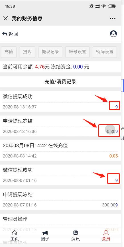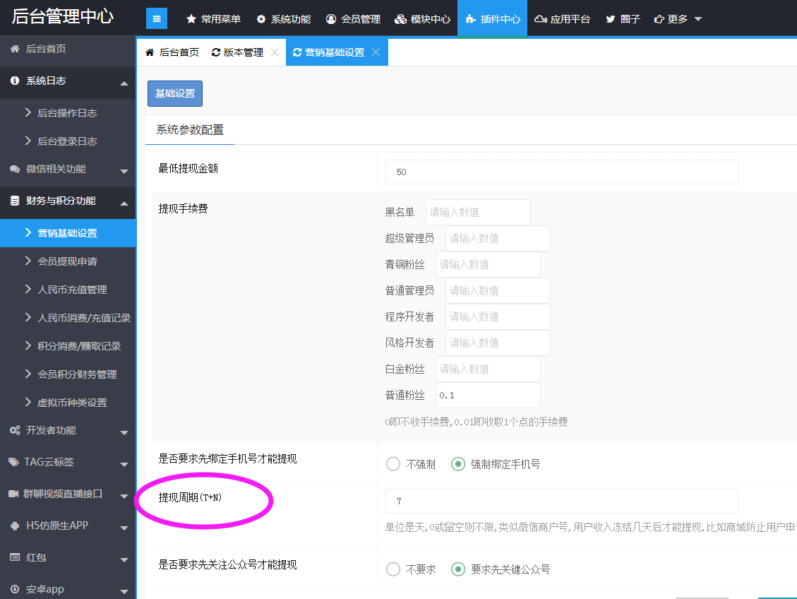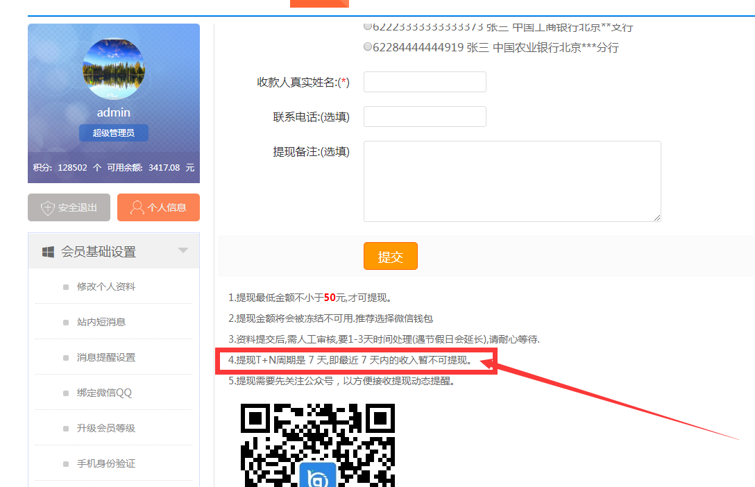 为此,我们仿微信商户功能,增加了T+N的提现周期开关设置. 大家可以根据自己的运营需要,设置最近多少天内的收入不能申请提现.