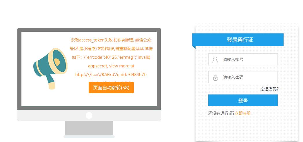 请教各位大佬,登录后台却报微信公众号方面等错,获取access_token失败,初步判断是 微信公众号(不是小程序) 密钥有误,请重新配置试试,详情如下:{"errcode":40125,"errmsg":"invalid appsecret, view more at http:\/\/t.cn\/RAEkdVq rid: 5f484bfe-