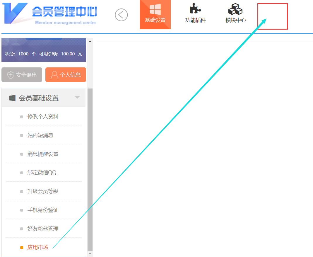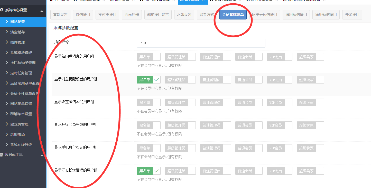 如下图所示,可以设置默认会员中心的基础菜单只给哪些用户组使用.