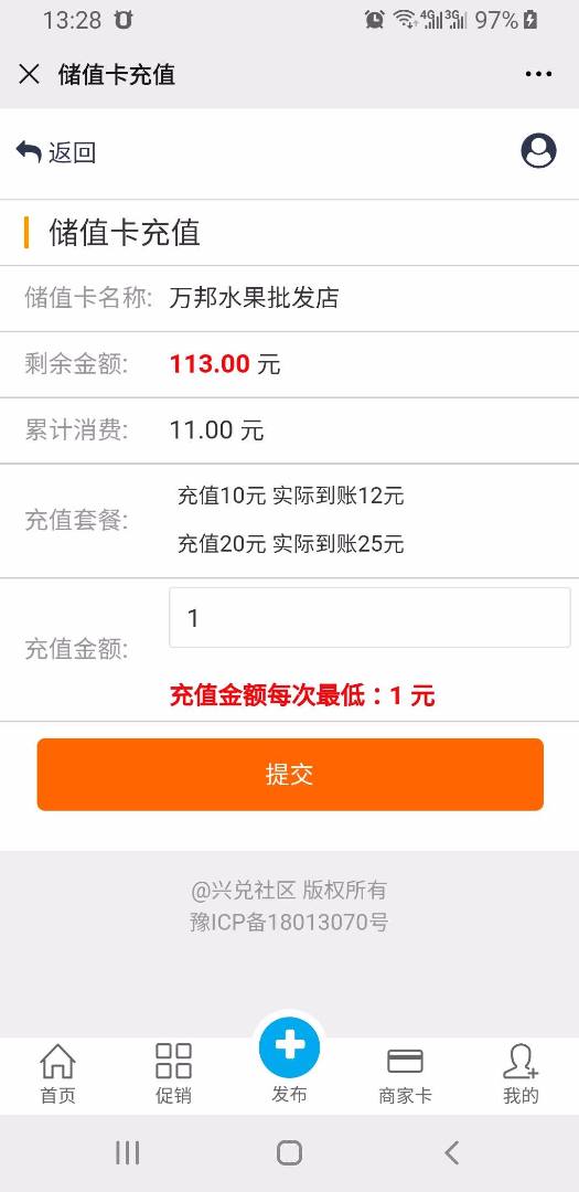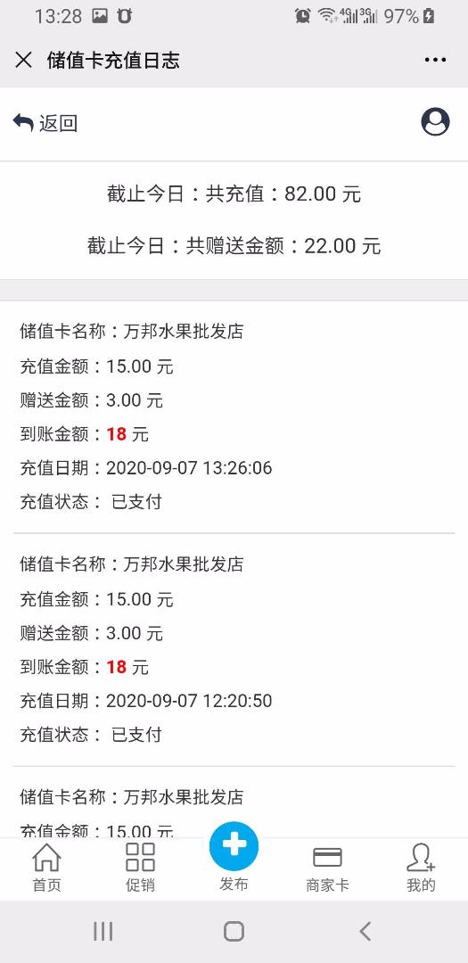 第二,算是一个bug吧,我设置了两个套餐,充值10元,到账12;充值20元到25元。然后我发现,充值15元到账了18元!这个奖励金额是3元,而不是2元,是按照比例增加了,而正常应该到账17元。因为15元,只够第一个套餐,不够第二个套餐,所以应该是奖励2元,而没有奖励3元这个套餐。