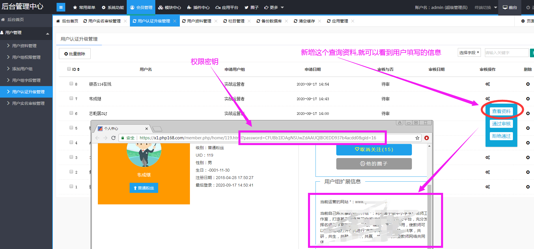 现在升级后,就可以在审核通过之前,可以先查看用户填写的资料,如果资料不齐全,就方便拒绝通过审核。而不必像以前那样,必须要审核通过才能看到用户到底填了什么信息。