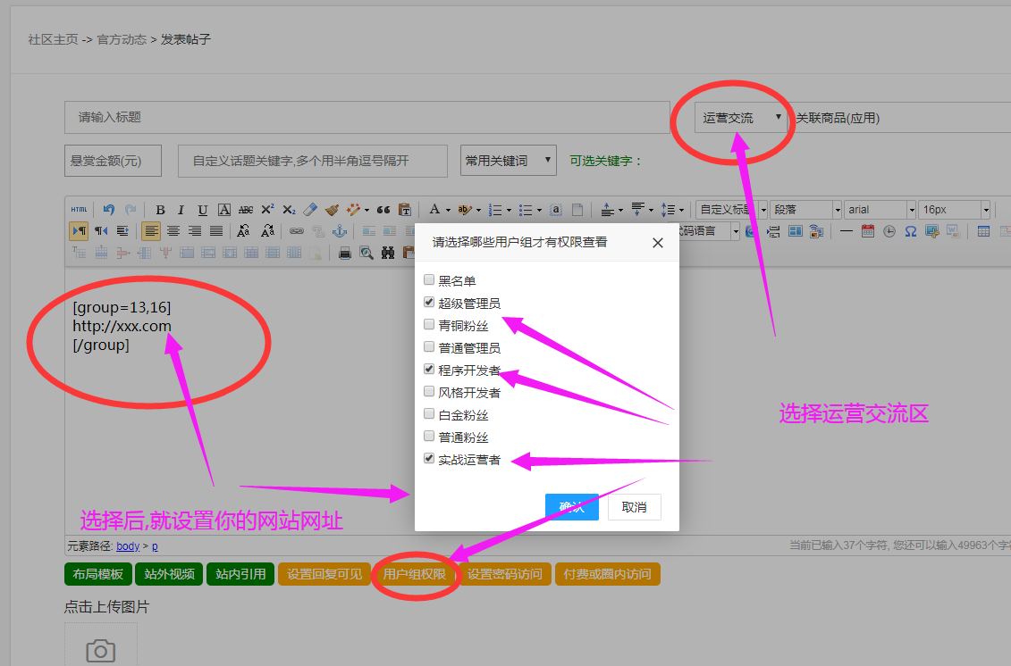 平时大家不想公开自己的网址,那么你可以按下图,设置指定的用户组才能查看。这样就不会让其它普通会员看到了。