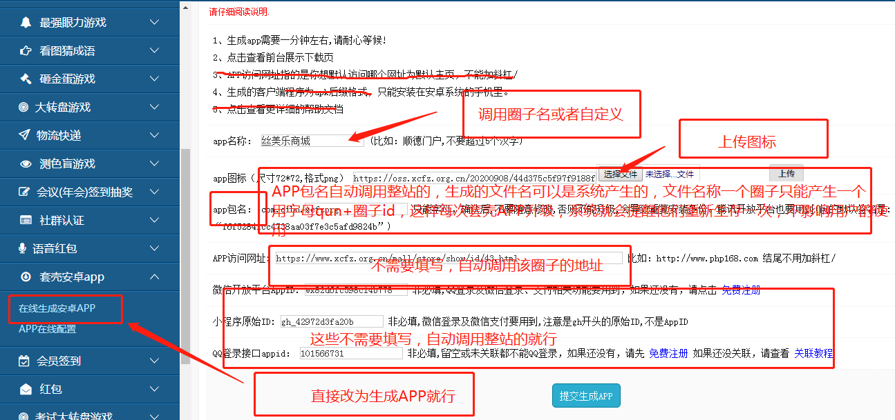 全民APP对于网站的发展起作关键词的作用,现在企业入住,他们都是希望他的企业能拥有终端APP、小程序、公众号和网站系统几合一,特别是现在用户受众多数以手机端,让用户下载APP安装,以便二次使用直接寻找,成了企业用户的夙愿。但他们对什么是APP根本不了解,只要能安装,能打开浏览到他们的页面就行,哪怕是套壳的,也能让他们心满意足!前几天为了给丝美乐纸巾厂入住我站的丝美乐商城实现APP功能在过程中发现,现在X1系统要实现全民APP(套壳)完全能实现。特别是圈子,只要在圈子管理中心,做一个APP生成页面,在调用一个下载页面就行,具体的见下图: