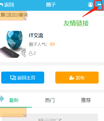 友情链接,目前只有管理员才有权限使用,如果把友情链接权限下放给每个圈主,那每个圈主就都可以有权限定义自己的跳转链接,再把友情链接做成圈子右上角的跳转按钮,那就意味着每个圈主都可以自由定义自己的跳转方式。在跳转菜单里,不但可以跳转自己想让用户去的圈子,也可以定义各种频道功能链接,甚至跳转到其它网站,比WAP顶部菜单更自由灵活,毕竟WAP顶部菜单只有管理员可管控,不能实现每个圈子自由控制。