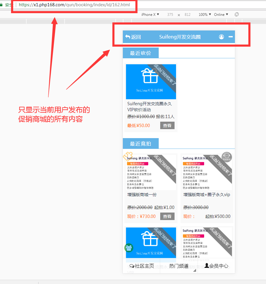 大家可以在手机上打开下面两个网址,将可以看到如下图,只显示相应圈子用户所发表的促销商城里各模块的所有信息。