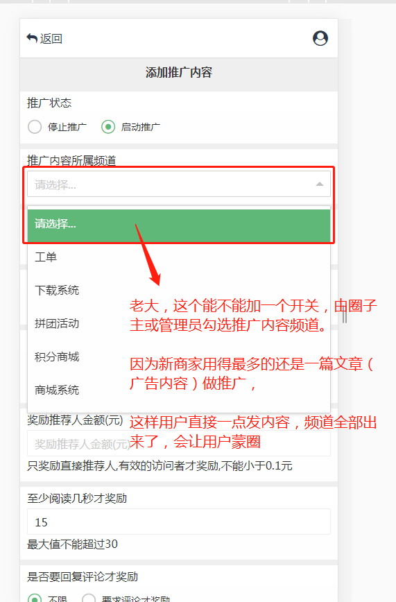 1、才安装了阅读奖励推广,也表示支持老大为大家的付出(当然自己也可能会用到)2、建议是发内容推广应该优化一下,现在是选择频道全部出来了,应该加一个开关,圈主或管理员勾选后才出现的推广频道(其实用户最多就是文章、图片等,里面带自己的地址和推广内容),这样才不能让用户蒙圈,体验也更好。