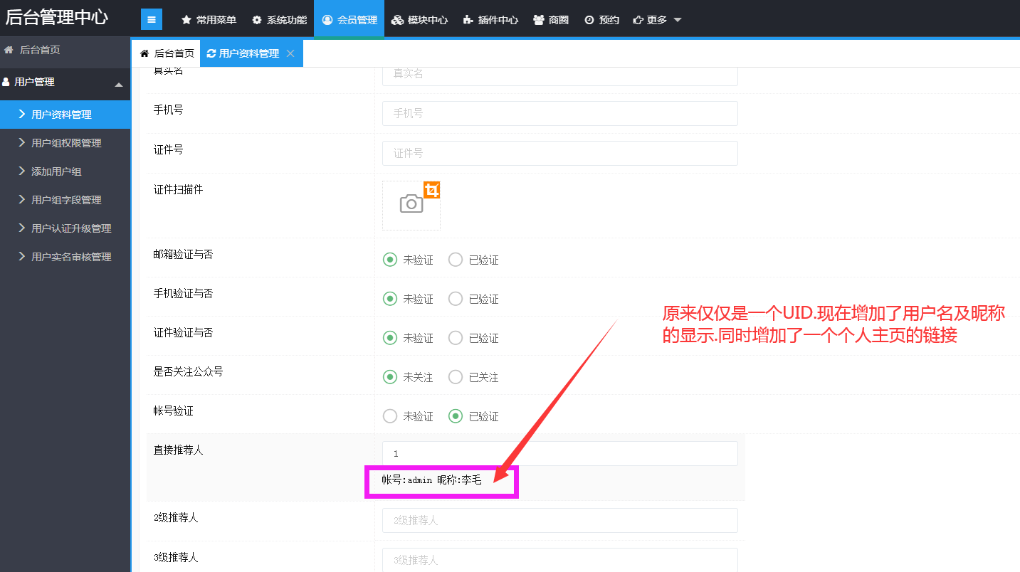 如下图所示,在部分用户的提议下,修改会员资料的时候,推荐人之前只显示一个用户UID,非常的不友好。现在增加了用户名与个人主页的链接。