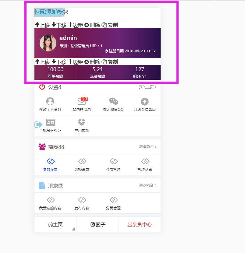 如下图所示,应个别用户提议,会员中心头部加入了碎片,将给大家可以有更大的扩展空间,比如你可以把现有的头部全删除掉。可以加上一些订单类的相关元素及菜单,将更适合商城使用。