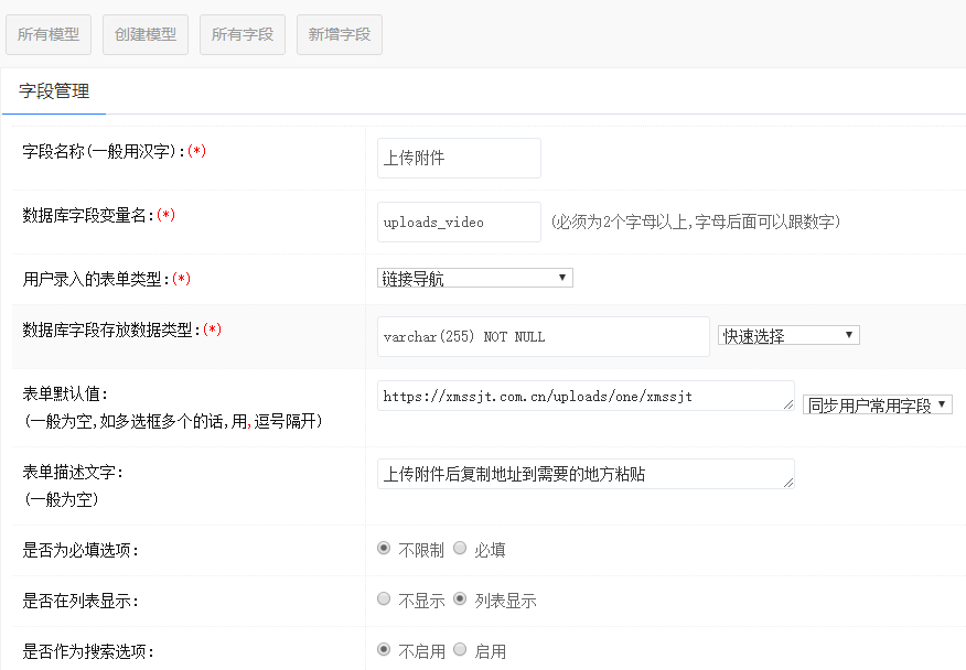 字段内容是这样设置的,不知道是哪里设置不对?按照这样设置后,已经清空缓存,浏览器也已清空缓存,但是前台发布贴子时,还是看不到这个“上传附件”的按钮或链接。