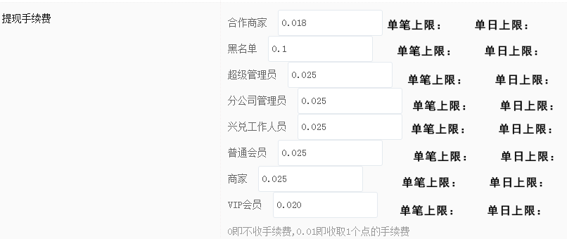 @admin 后台的提现手续费这里,加上,单日提现上限,和单笔提现上限吧。因为微信支付有这两个。。。如果商家输入的金额比微信的大,比较麻烦。