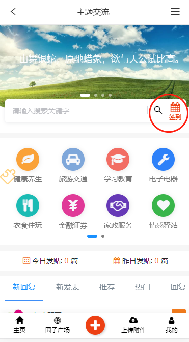 只是简单签到,在圈子首页添加个碎片,就可以把签到链接上去了。